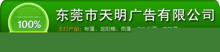东莞市天明帐篷厂是一家专业生产帐篷的独资企业,公司成立于2006年,在长期的市场竟争中积累经验,能根据客户要求设计﹑制造各款帐篷:固定帐篷﹑伸缩帐篷﹑异型帐篷﹑旅游帐篷﹑仓库式推拉帐篷﹑阳光板帐篷﹑展销帐篷﹑停车帐篷﹑广告帐篷﹑玻璃帐篷﹑雨篷﹑遮阳篷﹑帐房出租等。规格齐全,帐篷以“美观﹑时尚﹑适用﹑质优”的特点拥有广泛的市场,并在客户中获得良好的口碑。